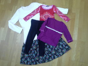 Doch seit meiner Overlock sieht das ganz anders aus! Ich übe noch und habe bisher überwiegend alte Kleidungsstücke umgenäht. Wenn daraus nichts wird, ärgere ich mich somit nicht um den verschwendeten Stoff. Und natürlich kann ich für Akari viele Sachen nähen. Da sie noch klein ist, kann ich ihr Kleidchen aus alten T-Shirts nähen oder Hosen, das macht total Spaß!